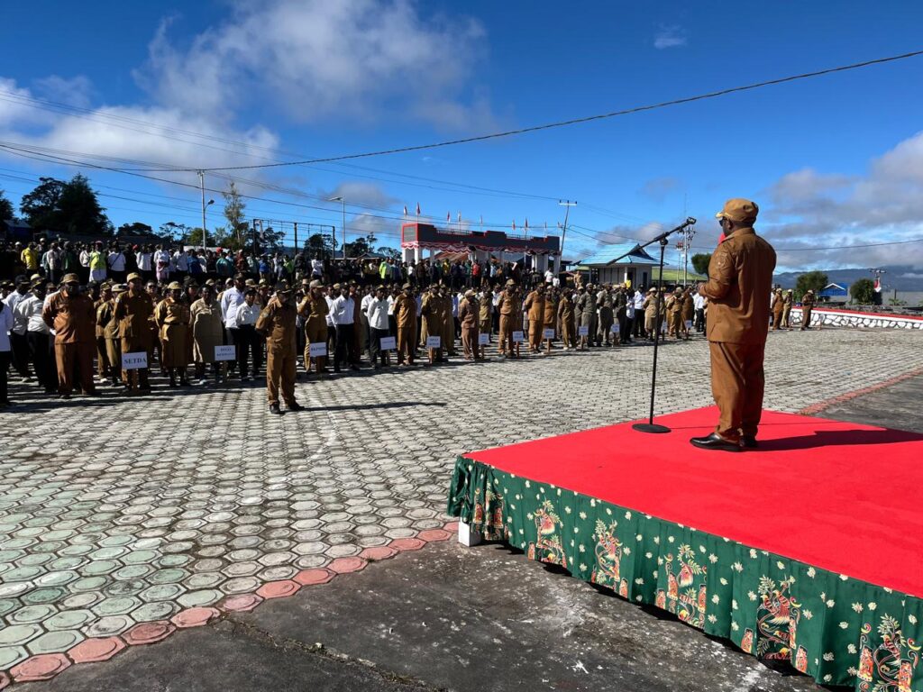 Deiyai, 29 September 2025 – Bupati Deiyai, Melkianus Mote, ST, memimpin apel gabungan Aparatur Sipil Negara (ASN) di halaman Kantor Bupati. Dalam amanatnya, ia mengeluarkan instruksi penting yang menekankan peningkatan disiplin kerja, efisiensi, serta reformasi sistem penggajian ASN di Kabupaten Deiyai.