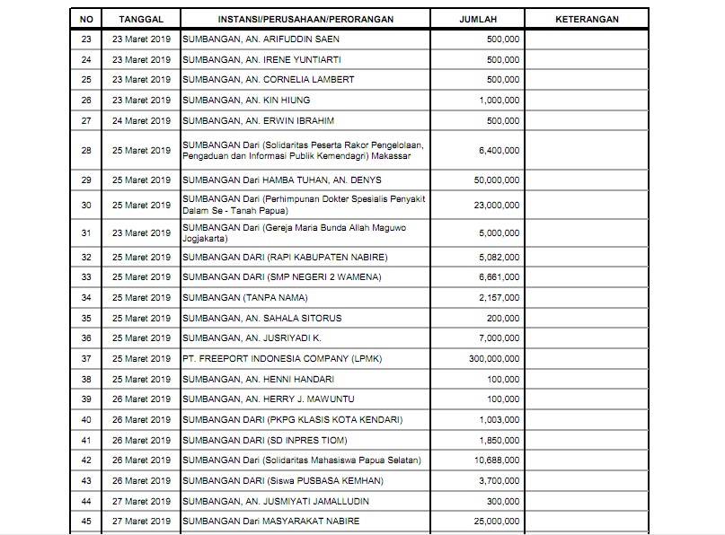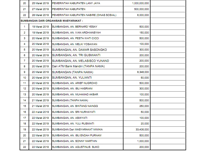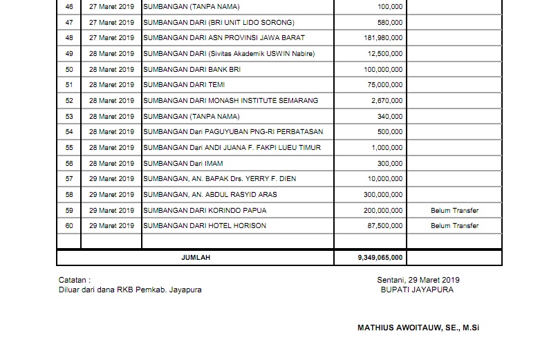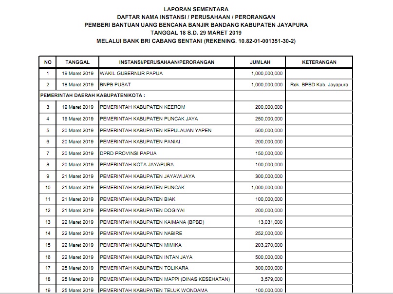 Berikut rincian laporan sementara dana bantuan bagi korban banjir bandang Sentani yang masuk di rekening banjir bandang Sentani di Bank BRI Cabang Sentani, hingga 29 Maret 2019 :