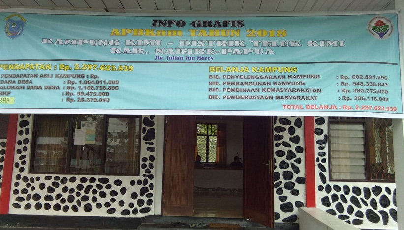Seperti diketahui, Dana Desa Tahap I Pemerintah Kampung Kimi di Tahun 2018 sebesar Rp. 1.064.011.000,- (Satu Milyar Enam Puluh Empat Juta Sebelas Ribu Rupiah), sementara Alokasi Dana Desa Tahap I Tahun 2018 sebesar Rp. 1.108.758.896,- (Satu Milyar Seratus Delapan Juta Tujuh Ratus Lima Puluh Delapan Ribu Delapan Ratus Sembilan Puluh Enam Rupiah), dan alokasi Dana Bagi Hasil Pajak & Retribusi Tahap I Tahun 2018 sebesar Rp.25.379.043,- (Dua Puluh Lima Juta Tiga Ratus Tujuh Puluh Sembilan Empat Puluh Tiga Rupiah).