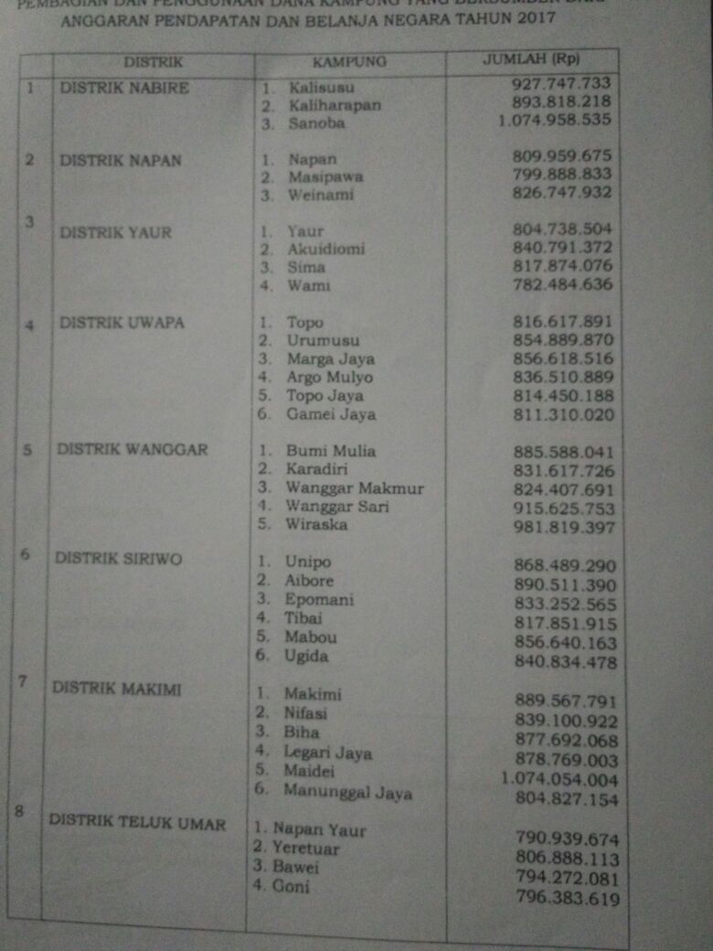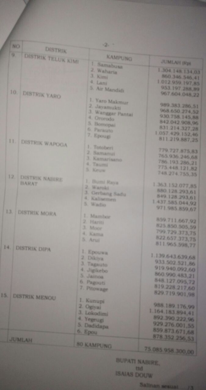 Seperti diketahui, dana desa yang dialokasikan kepada 80 kampung dari 15 Distrik yang ada di kabupaten Nabire sangat fantastis yakni sebesar Rp. 75.085.958.300,- (tujuh puluh lima miliar delapan puluh lima juta sembilan ratus lima puluh delapan ribu rupiah).