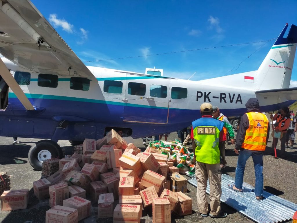 Bantuan yang tiba dengan pesawat tersebut terdiri dari bahan makanan seperti beras dan mie instan.