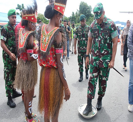 Kedatangan Danrem disambut dengan pengalungan bunga dan pemasangan mahkota burung cenderawasih oleh Tokoh Masyarakat, Herman Sayori, serta prosesi injak piring.