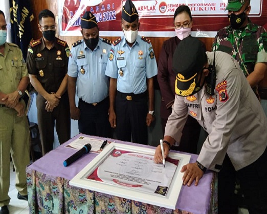Nabire, Dalam rangka menyatukan seluruh komitmen pegawai untuk bekerja sesuai dengan rencana yang diharapkan di Tahun 2022, jajaran insan pengayoman Lapas Kelas 2B Nabire melaksanakan deklarasi janji kinerja 2022 yang dirangkai dengan sejumlah penandatanganan komitmen dan pakta integritas.