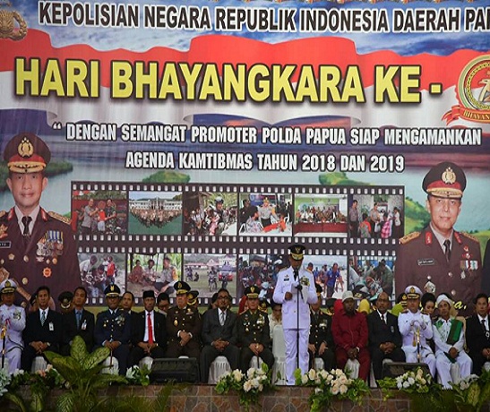 Presiden Joko Widodo dalam amanat tertulisnya yang dibacakan oleh Plt. Gubernur Papua, Mayjen TNI Purn Soedarmo, mengucapkan selamat Hari Bhayangkara ke 72 kepada segenap anggota dan keluarga besar Kepolisian Negara Republik Indonesia dimanapun berada dan bertugas, dari Sabang sampai Merauke, dan dari Miangas sampai Pulau Rote.