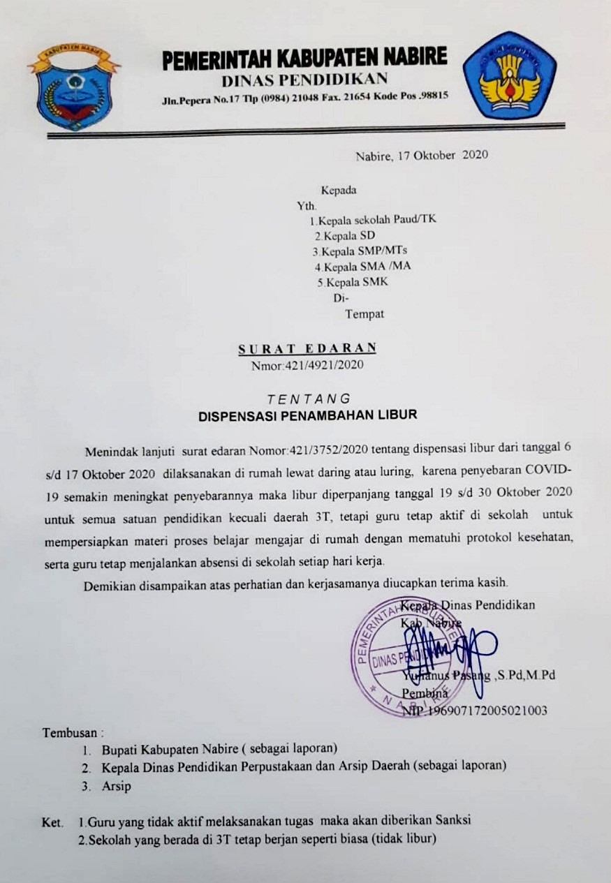 Hal tersebut sesuai dengan Surat Edaran dari Dinas Pendidikan Nabire Nomor 421/4921/2020 Tentang Dispensasi Libur, tertanggal 17 Oktober 2020.