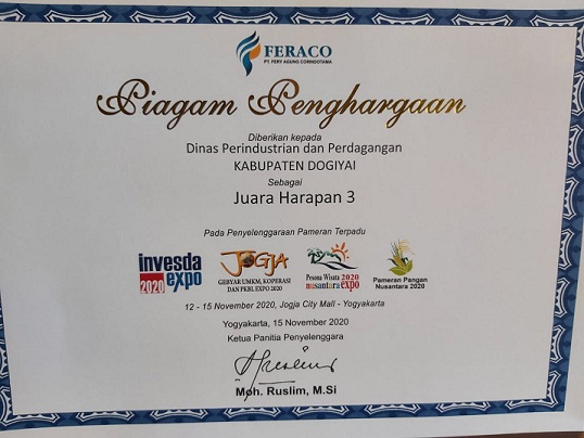 Jogja – Dinas Perindustrian dan Perdagangan (Perindag) kabupaten Dogiyai, berhasil tampil sebagai juara harapan 3 pada Pameran Indonesia Quality Expo 2020 yang dilaksanakan di Jogja City Mall Yogyakarta, dari tanggal 12 hingga 15 November 2020.