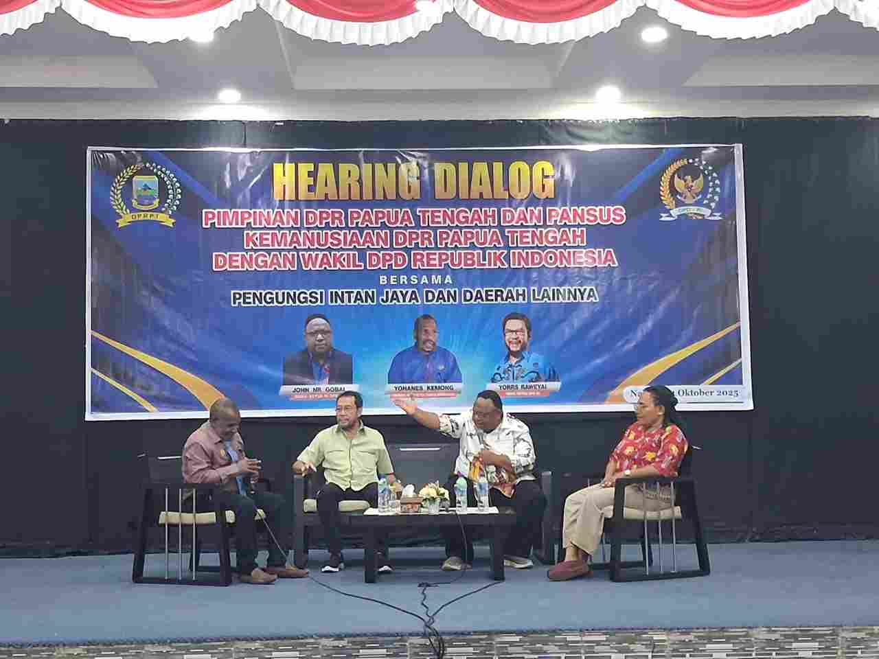 Nabire, 14 Oktober 2025 – Dewan Perwakilan Rakyat (DPR) Papua Tengah bersama Panitia Khusus (Pansus) Kemanusiaan DPR Papua Tengah dan Dewan Perwakilan Daerah (DPD) Republik Indonesia menggelar hearing dialog kemanusiaan bersama para pengungsi asal Intan Jaya dan wilayah terdampak lainnya, Selasa (14/10/2025), di Auditorium RRI Nabire.