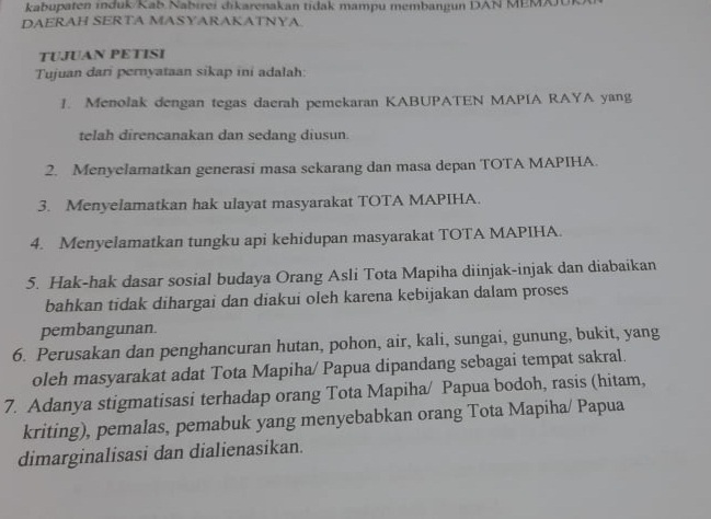 Dalam aspirasi tersebut, mahasiswa dan perwakilan masyarakat menolak rencana pemekaran kabupaten Mapia Raya, demi menyelamatkan hak-hak dasar masyarakat, hak ulayat, sumber daya alam dan tungku api kehidupan masyarakat Tota Mapiha.