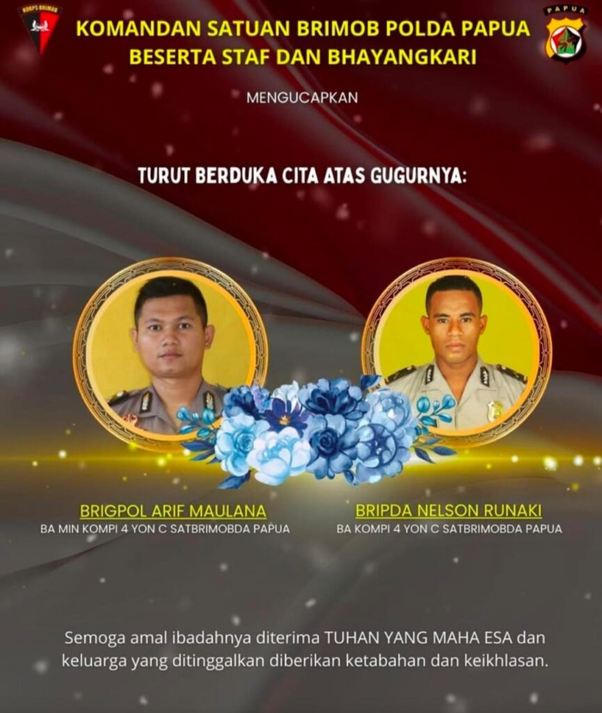 Kedua korban adalah Brigpol Arif Maulana, BA MIN Kompi 4 Yon C Sat Brimob Polda Papua, dan Bripda Nelson Runaki, BA Kompi 4 Yon C Sat Brimob Polda Papua.