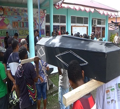 Selain menyerahkan pernyataan sikap kepada Komisioner KPU Nabire, Daniel Marin, massa juga menyerahkan dua peti mati sebagai simbol kematian demokrasi di daerah ini. Kedua peti mati tersebut ditujukan kepada KPU Nabire dan DPRD Nabire.