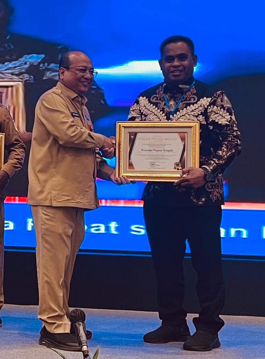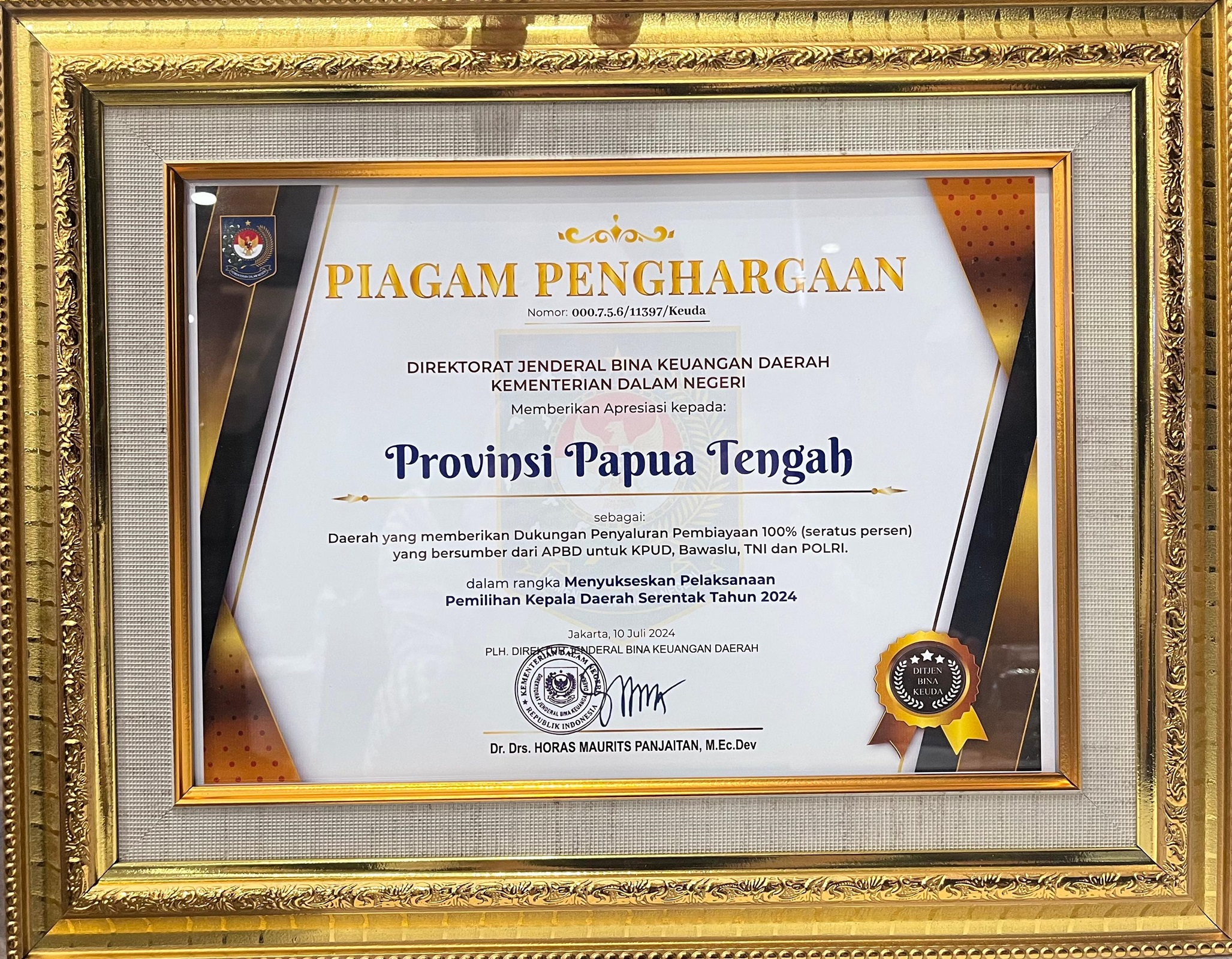 Nabire, 16 Juli 2024, Pemerintah Provinsi Papua Tengah menerima penghargaan dari Direktorat Jenderal Bina Keuangan Daerah Kementerian Dalam Negeri (Kemendagri) atas komitmen dan dukungan penuh dalam menyukseskan penyelenggaraan Pemilihan Kepala Daerah (Pilkada) Serentak Tahun 2024.