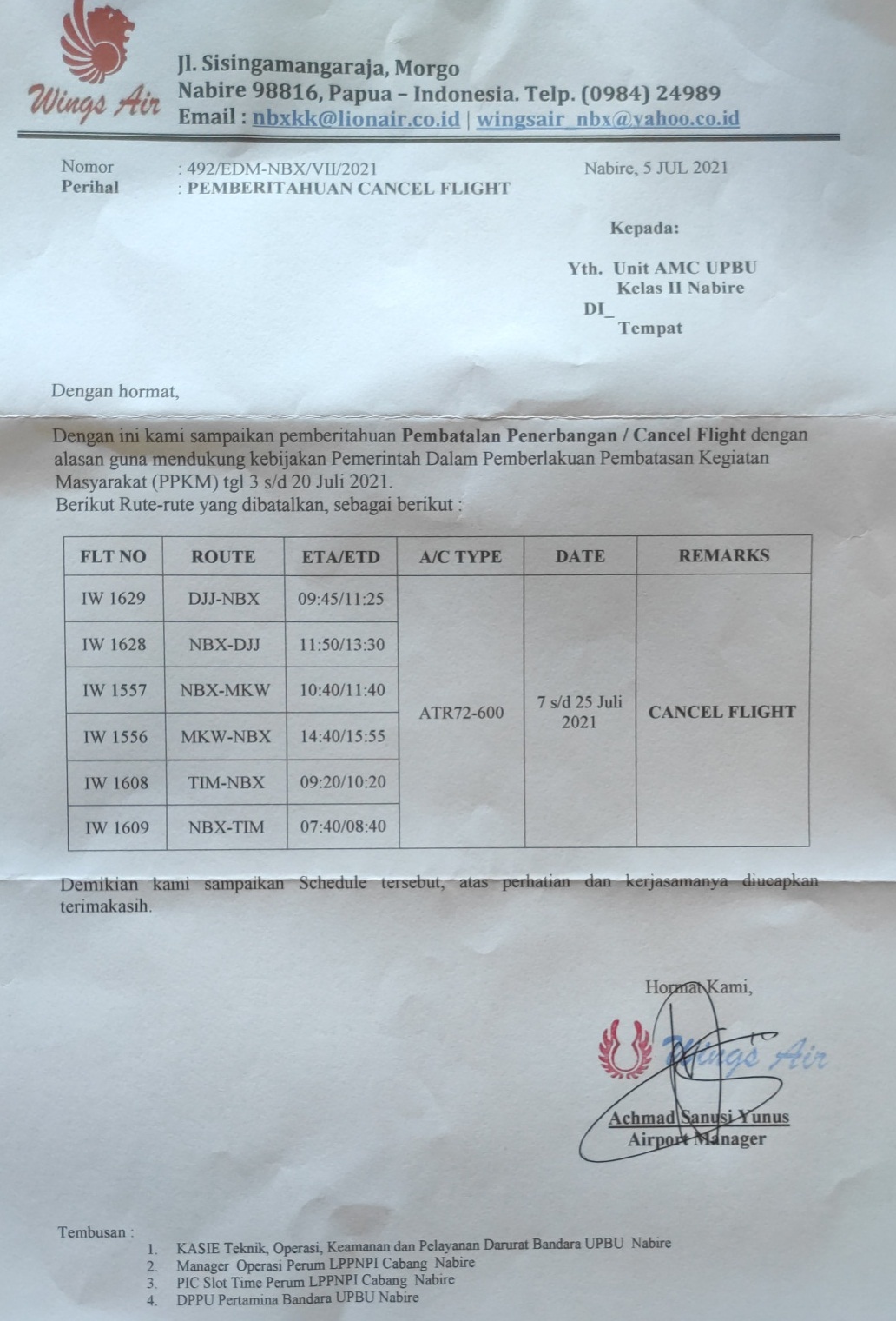 Nabire, Maskapai Wings Air, mulai tanggal 7 hingga 25 Juli 2021 akan menghentikan sementara layanan penerbangannya di Nabire.