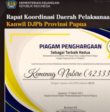 5. Cara membuat DutPut secara teori dan Aplikasi, mengakhiri kegiatan saat itu juga jorenta mengatakan berita gembira bahwa Kemenag Nabire (423331) mendapat penghargaan IKPA tingkat Provinsi dari Dirjen Perbendaharaan Provinsi Papua kategori Pagu kecil (Peringkat ke – 2 dari seluruh Kementerian/Lembaga Se- Provinsi Papua).