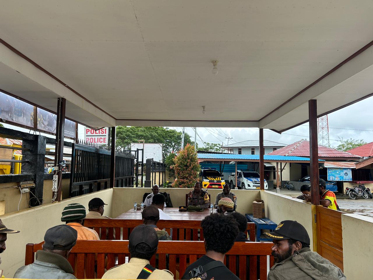 Dogiyai – Kasat Binmas Polres Dogiyai, Ipda Onesimus Iyawau, S.Th, bersama Kapolsek Kamuu, Iptu Hans N. Raubaba, S.E, menggelar tatap muka dengan tokoh-tokoh masyarakat dan Kepala-Kepala Distrik, bertempat di Aula Polres Dogiyai, Kamis (09/05/2024).