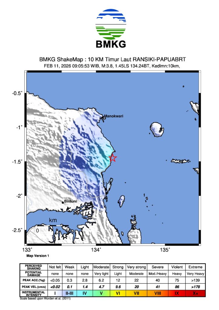 Manokwari, 11 Februari 2026 – Gempa bumi tektonik berkekuatan Magnitudo 3,8 mengguncang wilayah Ransiki, Kabupaten Manokwari Selatan, Provinsi Papua Barat, pada Rabu (11/2/2026) pukul 11.05.53 WIT. Gempa ini dirasakan langsung oleh masyarakat setempat, namun tidak menimbulkan kerusakan serius.