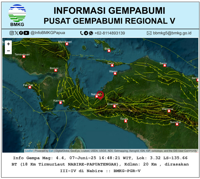 Nabire, 7 Juni 2025 – Gempa bumi tektonik dengan magnitudo 4,4 mengguncang wilayah Kabupaten Nabire, Papua Tengah, pada Sabtu sore (07/06) pukul 16.48 WIT.