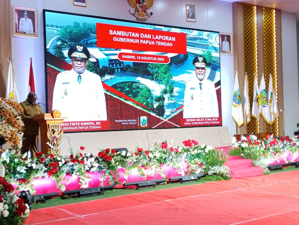 Nabire, 12 Agustus 2025 – Gubernur Papua Tengah, Meki Nawipa, memaparkan berbagai capaian pembangunan daerah dalam kegiatan Papua Bersatu, Indonesia Maju: Menuju Generasi Sehat, Ekonomi Mandiri dan Kampung Terpadu yang digelar di Ballroom pada Selasa (12/08/2025). Pemaparan tersebut disampaikan langsung di hadapan Menteri Koperasi, Menteri Desa dan Kepala Badan Gizi Nasional (BGN).