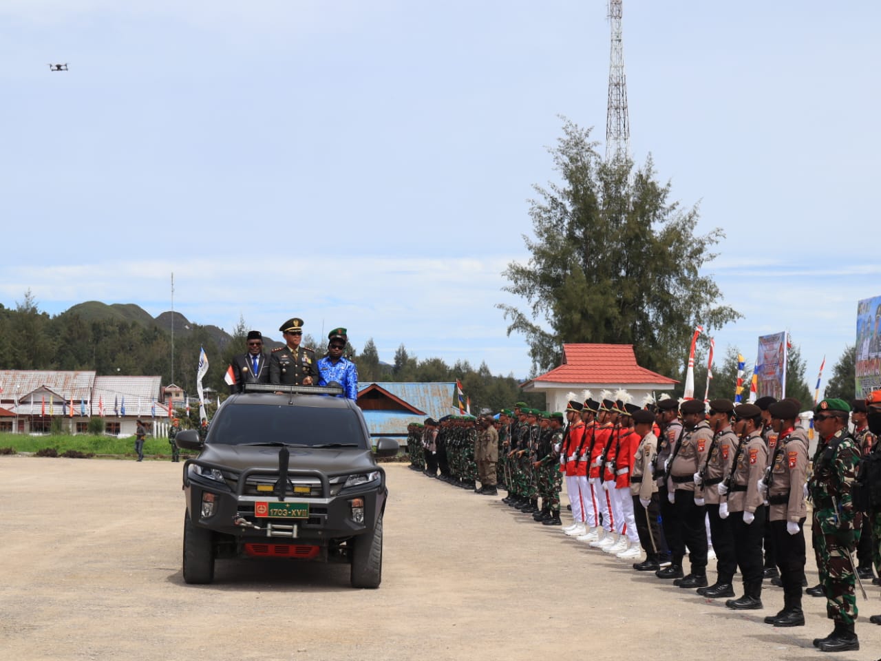 Hadir dalam upacara ini, Dandim 1703/Deiyai, Letkol Inf I Wayan Dedi Surianto, SE., yang juga menjadi Inspektur Upacara, Bupati Paniai, Meki Nawipa, Ketua DPRD Paniai, Sem Nawipa, Danyon Satgas 527/BY, Letkol Inf Rakil Jaya Utama, Kapolres Deiyai, Kompol I Made Suastika, beserta PJU TNI/Polri, beserta tamu undangan.