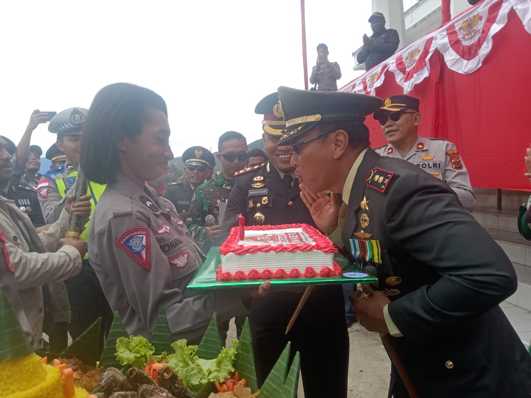 Usai upacara, Kapolres Paniai memimpin penyerahan kue ulang tahun kepada Dandim/1703 Deiyai, Letkol Inf I Wayan Dedi Surianto, SE.