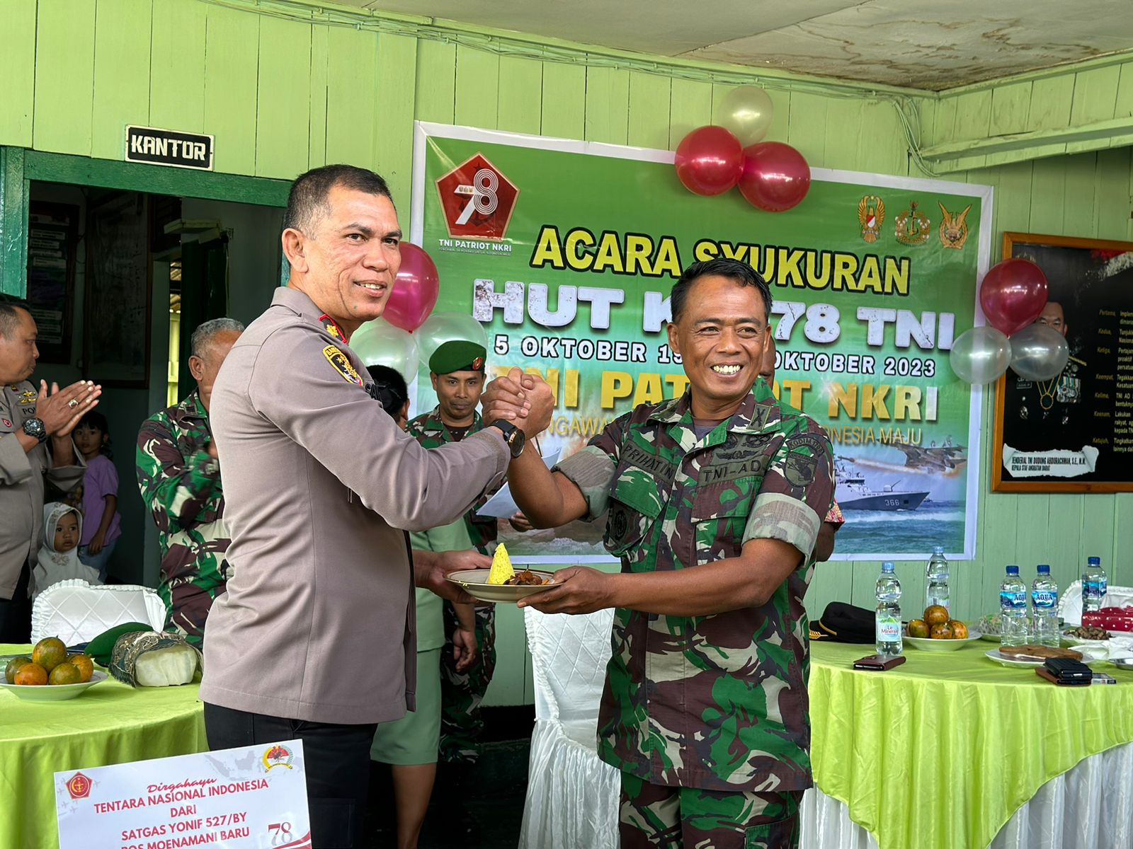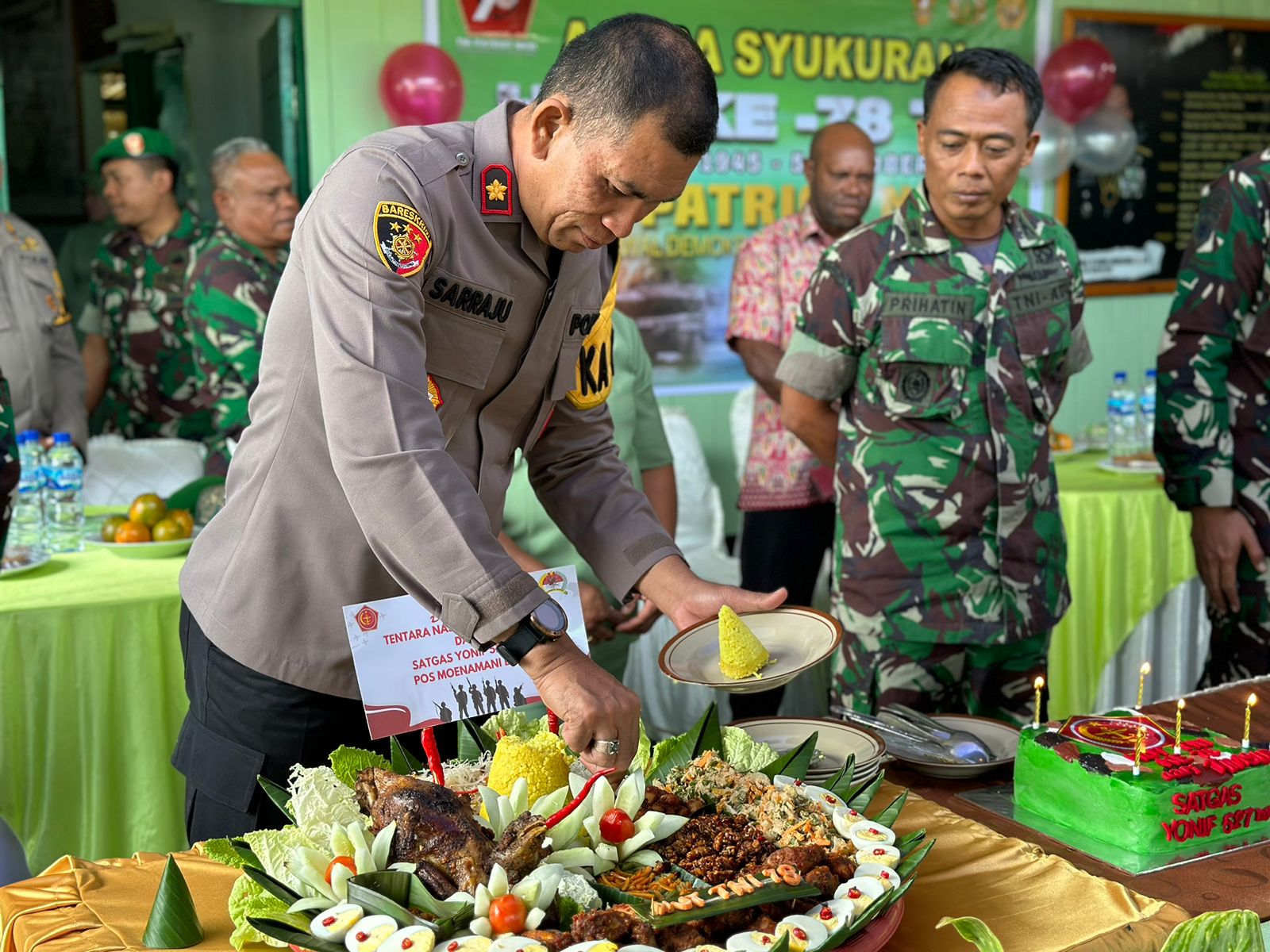 Dalam syukuran HUT TNI ke-78 tahun 2023, Kapolres Dogiyai didaulat untuk memotong tumpeng pertama kali yang kemudian diserahkan ke Pabung Moanemani, Mayor Inf. Prihatin.
