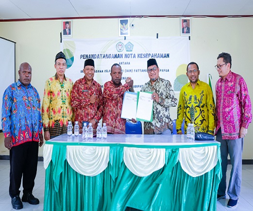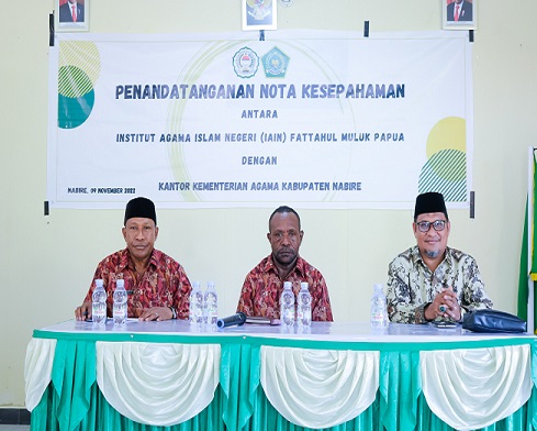 Nabire, Dalam rangka pen.gembangan Sumber Daya Manusia di bidang Pendidikan dan Bimbingan Masyarakat Islam, telah dilaksanakan Penandatanganan Nota Kesepahaman Kerjasama (MoU) antara Institusi agama islam (IAIN) Fattahul Muluk Papua dengan Kantor Kementerian Agama Kabupaten Nabire, Rabu (09/11/2022) bertempat di Aula Kantor Kementerian Agama Kabupaten Nabire.