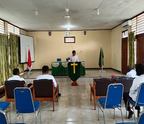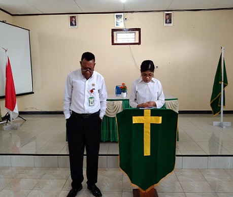 Ibadah dibuka dengan Nyanyian pembukaan dan Doa penutup dengan Doa syukur oleh Kepala Sub Bagian Tata Usaha,Robert Wopairi,S.Th berlangsung dengan aman dan lancar bertempat di Aula Kantor Kementerian Agama Kabupaten Nabire.