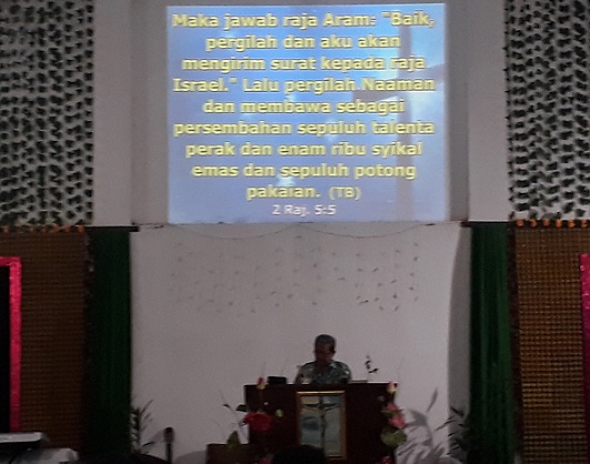 Ibadah tersebut dipimpin oleh pelayan firman, Pdt. Paulus Appang, dengan mengambil pembacaan firman dari perjanjian lama kitab 2 Raja-Raja 5:1 dan seterusnya.