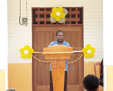 Sambutan pertama sampaikan pleh ketua Panitia Pembangunan Piter Gobai untuk menyampaikan laporan uang yang sudah digunakan berjumlah 183.300.000 (Seratus Delapan tiga juga tiga ratus ribu rupiah) serta sumbangan Mimbar, Kursi dan daun Seng penyelesaian Gedung Ibadah yang baru.