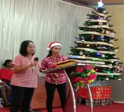 Ibadah Natal Sekolah Minggu ini dipandu oleh Yeni Oktavia dan Susan Yvon Siwalete, serta dalam acara diisi dengan persembahan pujian dari kelas Indria.
