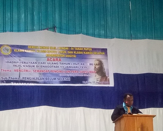 Dogiyai – Warga Gereja Kingmi di tanah Papua, senin 14 Januari 2019 memperingati HUT ke-80 masuknya Injil Empat Berganda di Pegunungan Tengah Papua dalam suatu ibadah syukur dipusatkan di Aula Klasis Kamu, Kabupaten Dogiyai.