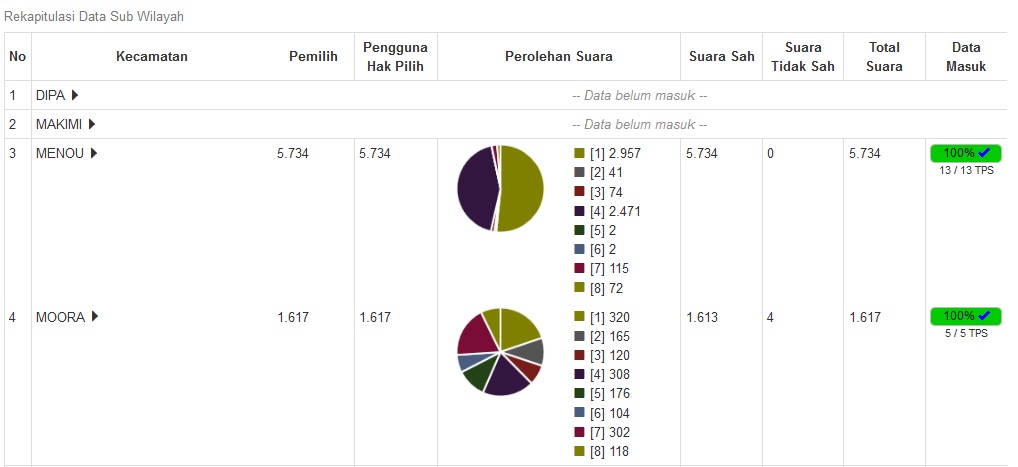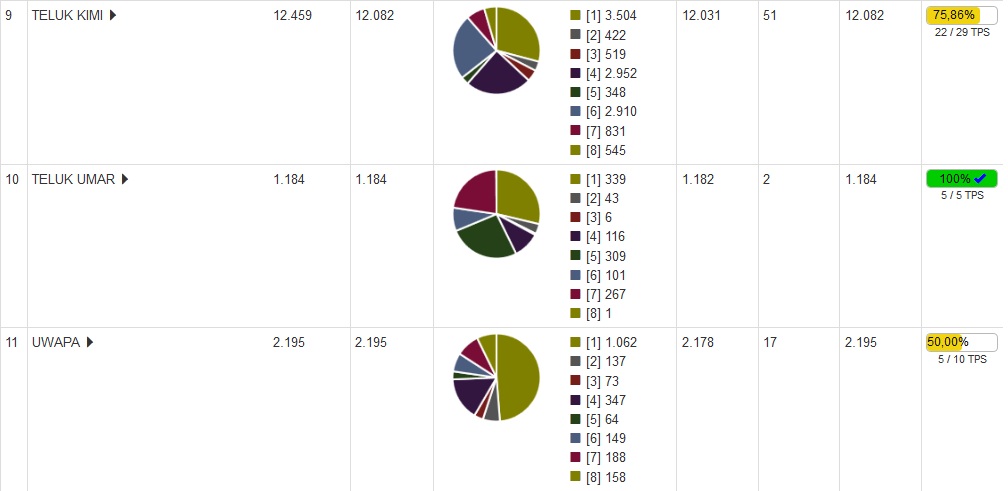 Dari 9 Distrik yang sudah masuk ke KPUD Nabire, baru 3 Distrik yang sudah 100% perhitungan suaranya yaitu Distrik Menou, Distrik Moora dan Distrik Teluk Umar.