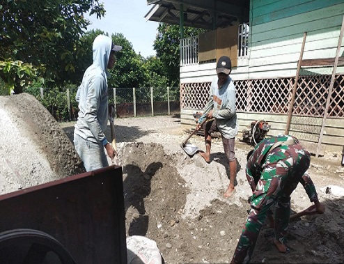 Nabire, Dalam rangka mengimplemetasikan salah satu dari Delapan Wajib TNI yang berbunyi “Menjadi contoh dan mempelopori usaha usaha untuk mengatasi kesulitan rakyat sekelilingnya”, Anggota Babinsa Koramil 1705-01/Nabire Pos Ramil Wanggar, Serka Sigit Aditya, turut membantu plester lantai rumah warga RT 09/RW 03, Kampung Yaro Makmur (Yaro 1), Distrik Yaro, Kabupaten Nabire, Papua Tengah.