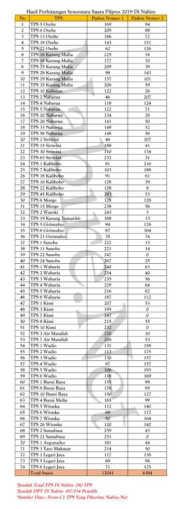 Ini Hasil Perhitungan Suara Sementara Pilpres 2019 Di Sejumlah TPS Di Nabire