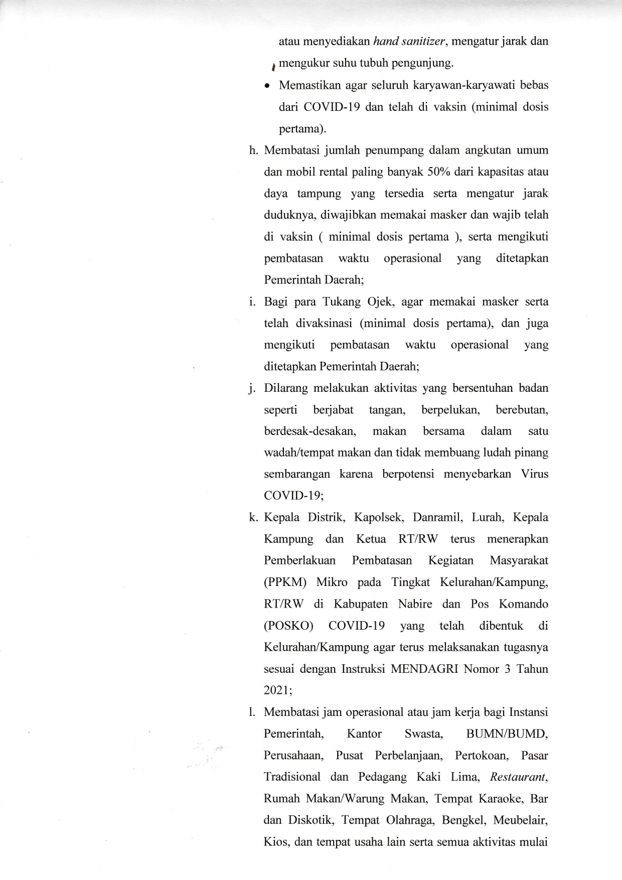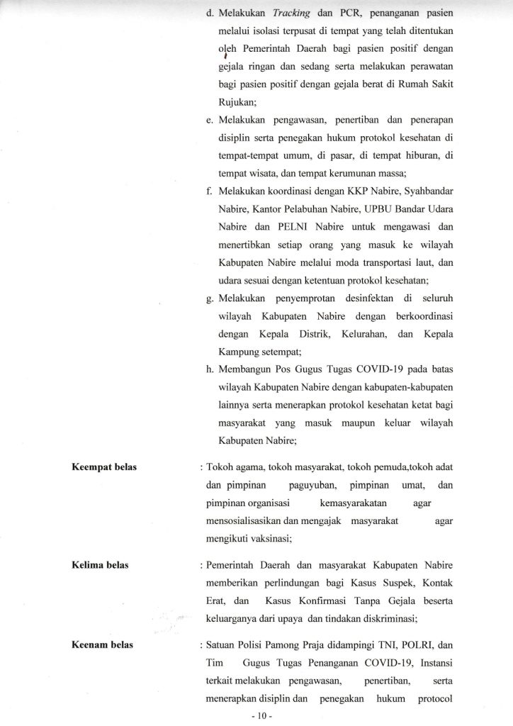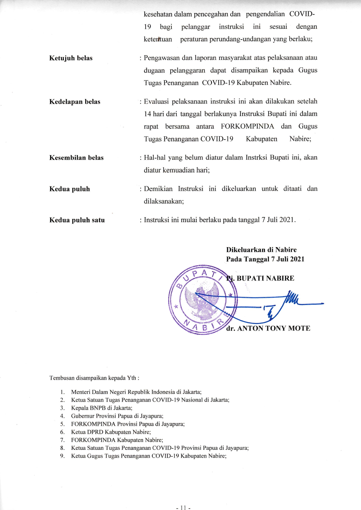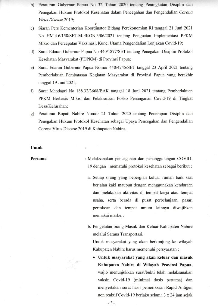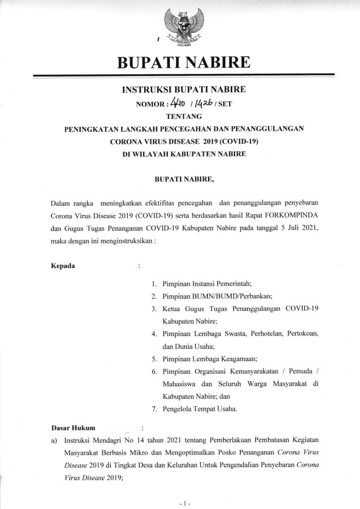 Nabire, Guna menindaklanjuti hasil pertemuan Forkopimda pada hari senin (05/07/21), telah dikeluarkan Instruksi Bupati Nabire tentang peningkatan langkah pencegahan dan penanggulangan Covid-19 di wilayah kabupaten Nabire.