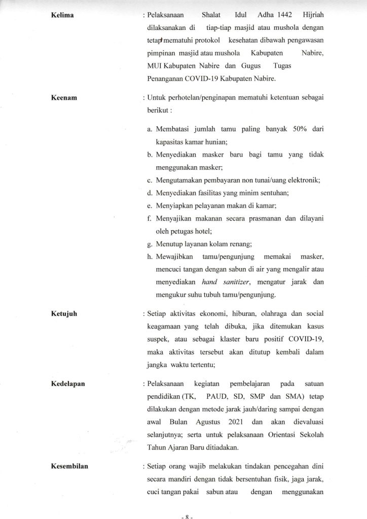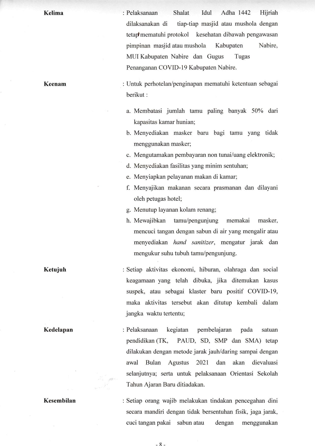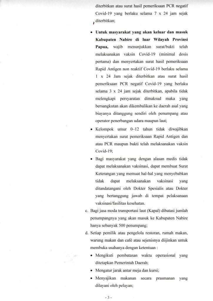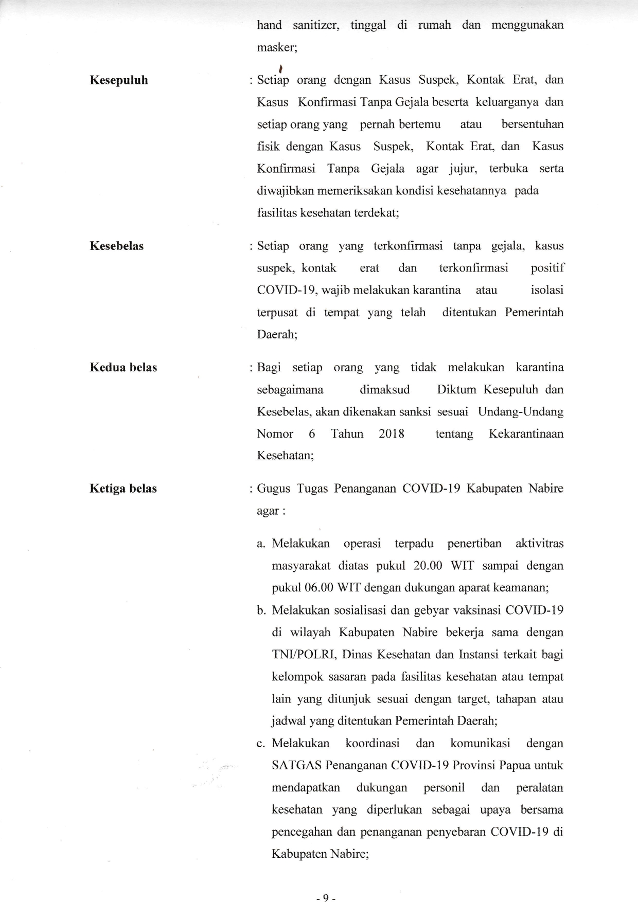 Nabire, Guna menindaklanjuti hasil pertemuan Forkopimda pada hari senin (05/07/21), telah dikeluarkan Instruksi Bupati Nabire tentang peningkatan langkah pencegahan dan penanggulangan Covid-19 di wilayah kabupaten Nabire.