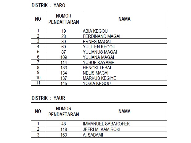 Berikut daftar nama para anggota Panitia Pemilihan Distrik (PPD) yang lulus dalam seleksi administrasi yang dilaksanakan KPU Nabire :