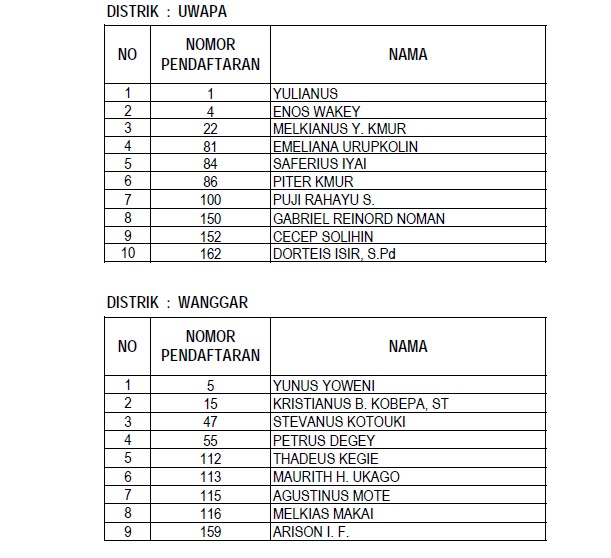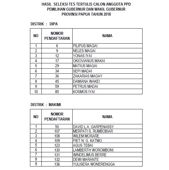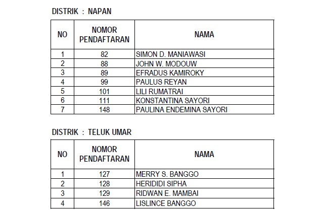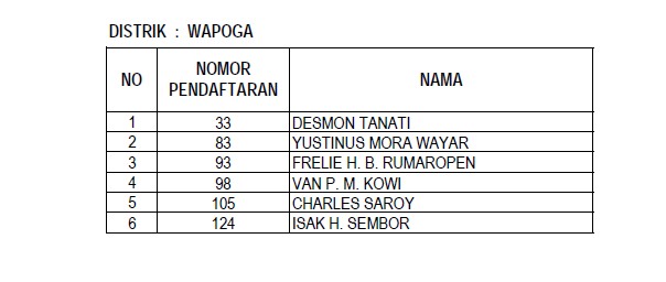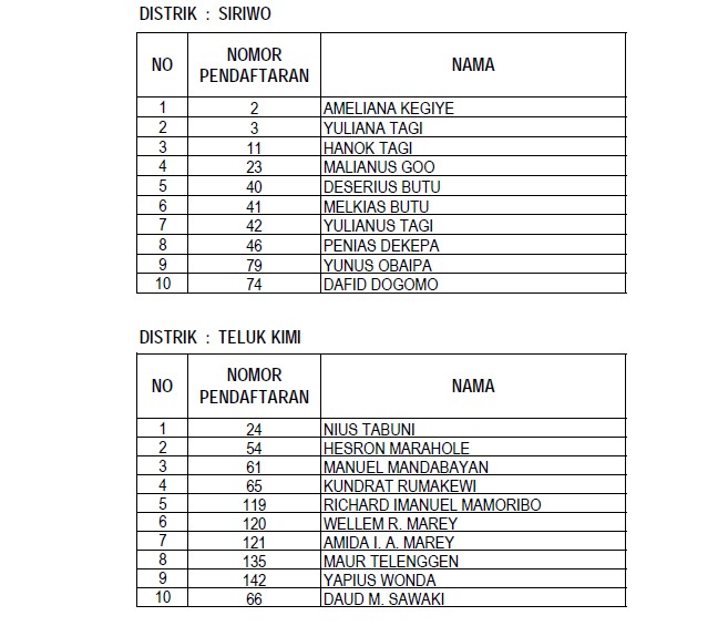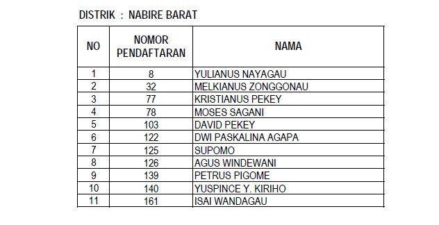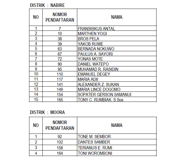 Berikut daftar nama para anggota Panitia Pemilihan Distrik (PPD) yang lulus dalam seleksi administrasi yang dilaksanakan KPU Nabire :