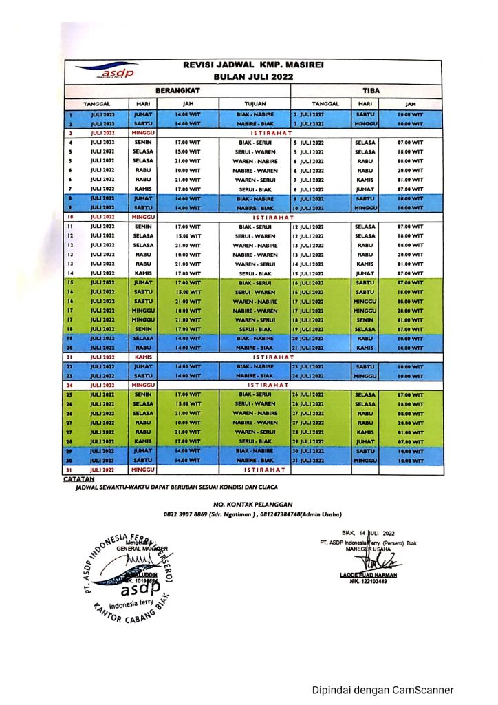 Hal tersebut dibenarkan Supervisor Kapal Ferry Pos Nabire, Rudi Kwando. Rudi Kwando, kepada Nabire.Net, Kamis (14/07/2022) memberikan revisi jadwal pelayaran kapal feri KMP Masirei untuk bulan Juli 2o22.