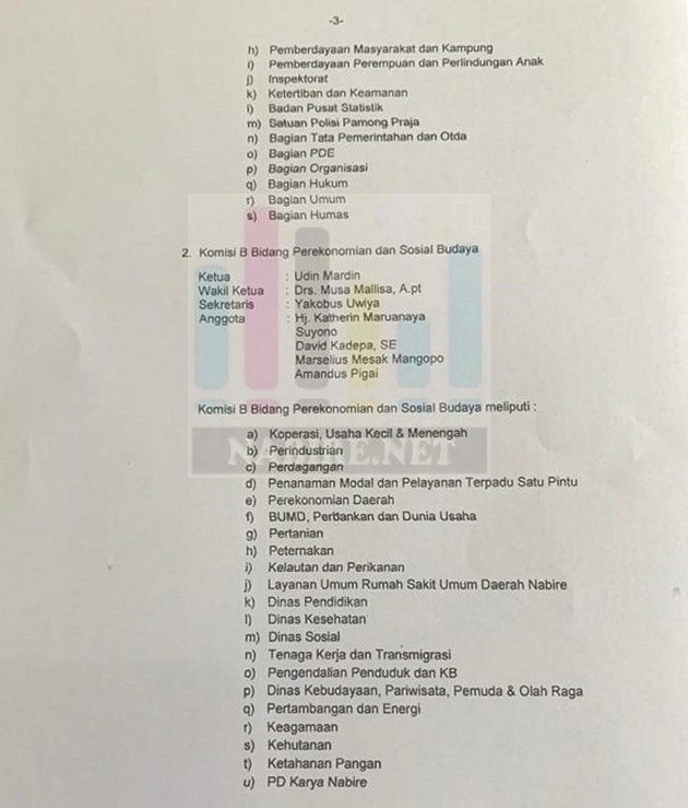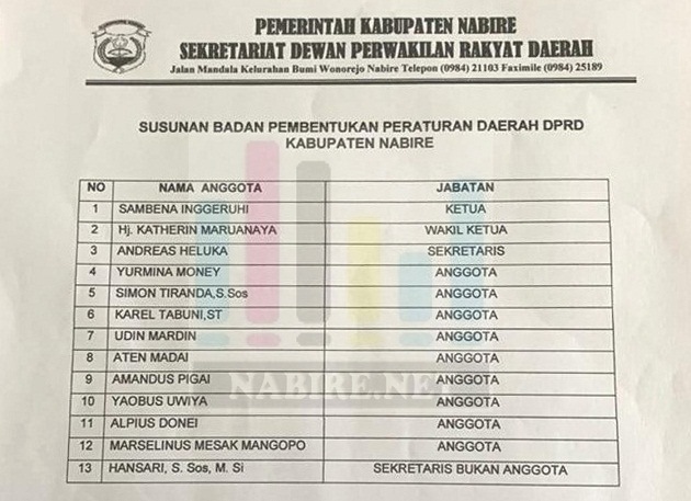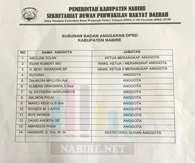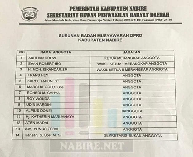 Berikut daftar lengkap kelengkapan DPRD Nabire yang telah dibentuk untuk masa bakti 2019-2024 :