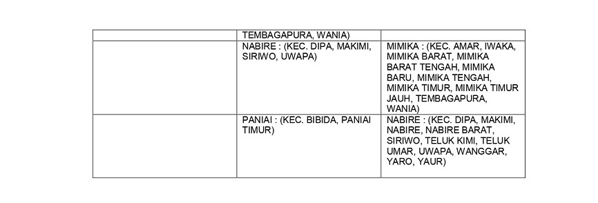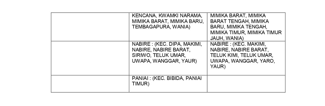 Daerah-daerah tersebut diantaranya sebagian kabupaten Nabire, Deiyai, Dogiyai, Paniai, Mimika, Mamberamo Raya, Mamberamo Tengah, Jayapura dan Keerom.