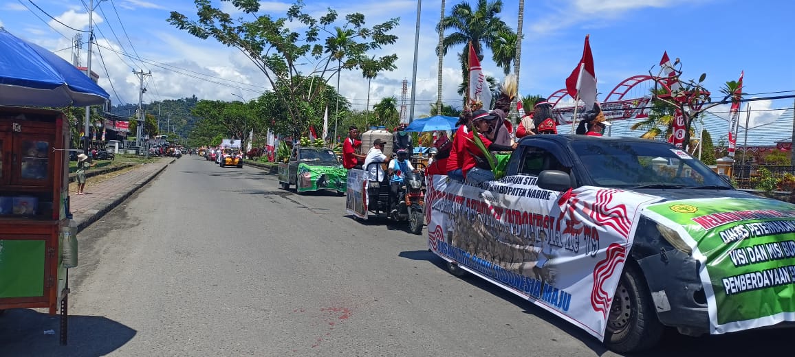 Nabire, 15 Agustus 2024 – Dalam rangka memeriahkan HUT Kemerdekaan RI ke-79, Pemerintah Provinsi Papua Tengah menggelar karnaval kendaraan hias yang berlangsung meriah pada Kamis pagi (15/08/2024). Acara yang menjadi tradisi tahunan ini dimulai pukul 10.00 WIT, dengan rute karnaval yang melintasi berbagai titik penting di Nabire.