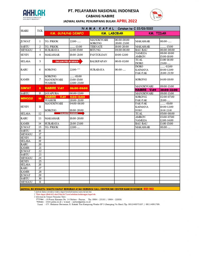 Dan berikut jadwal Kapal Pelni yang akan melayani pelabuhan Samabusa Nabire hingga pertengahan bulan April 2022 :