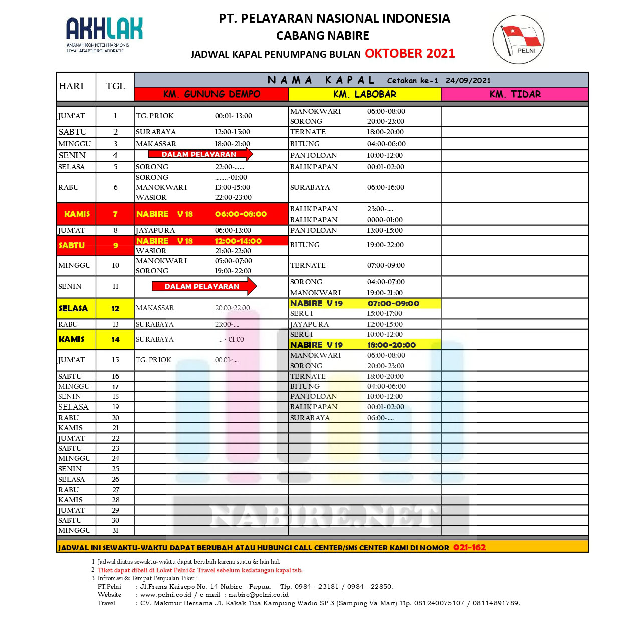Dan berikut jadwal Kapal Pelni yang akan melayani pelabuhan Samabusa Nabire selama bulan Oktober 2021 :