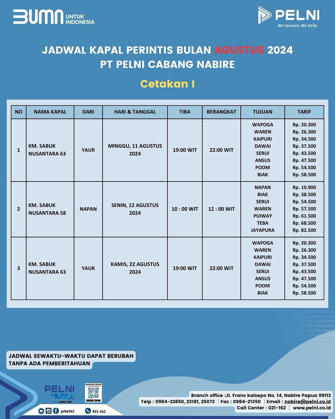 Nabire, 6 Agustus 2024 – Di bulan Agustus 2024, PT. Pelni Nabire akan mengoperasikan dua kapal perintis yang melayani pelabuhan Samabusa Nabire.