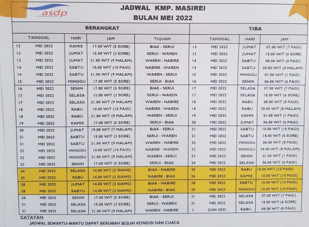 Berikut ini jadwal pelayaran kapal ferry, KMP Masirei selama bulan Mei 2022 :