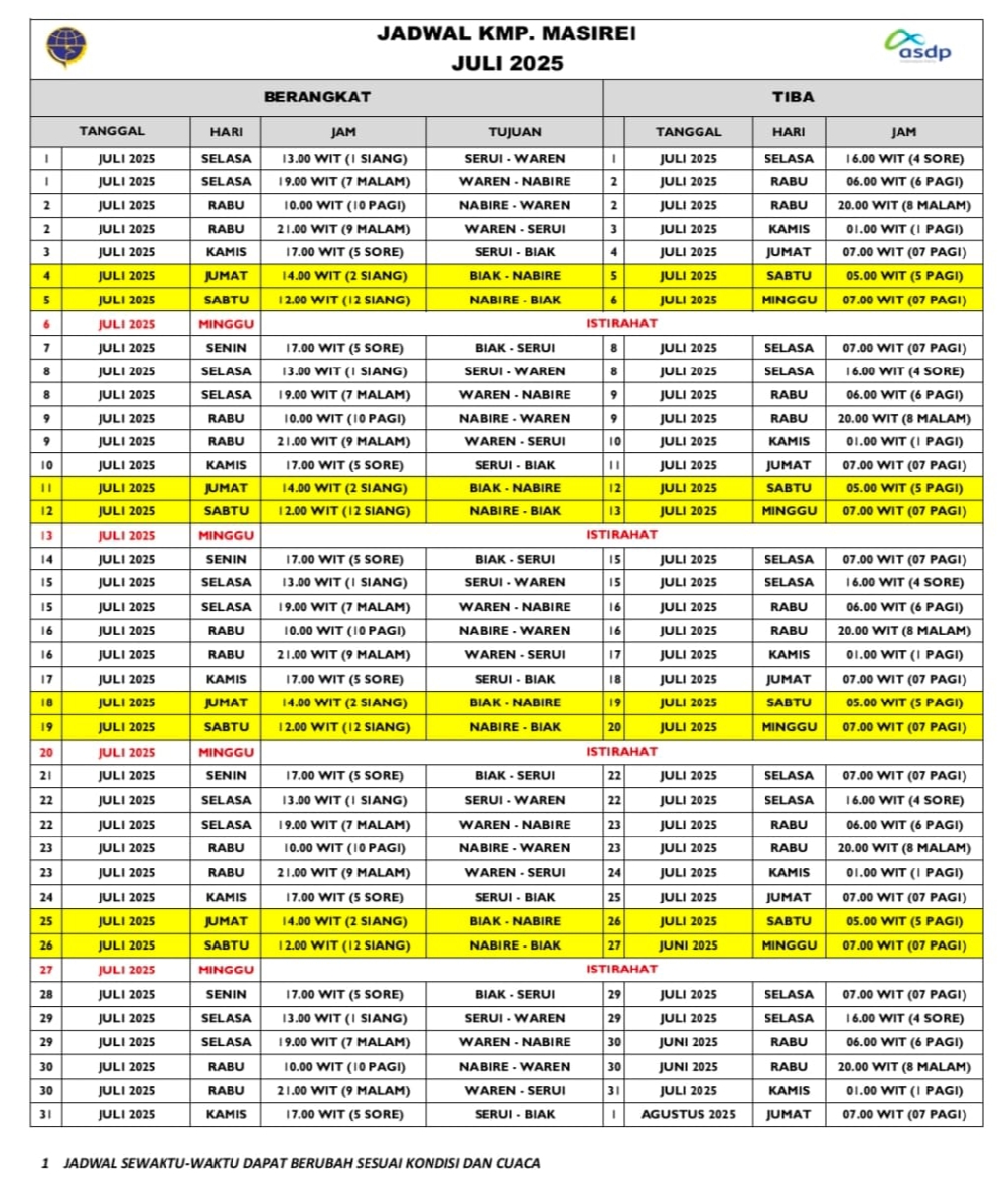 Berikut ini jadwal pelayaran kapal ferry, KMP Masirei selama bulan Juli 2025 :