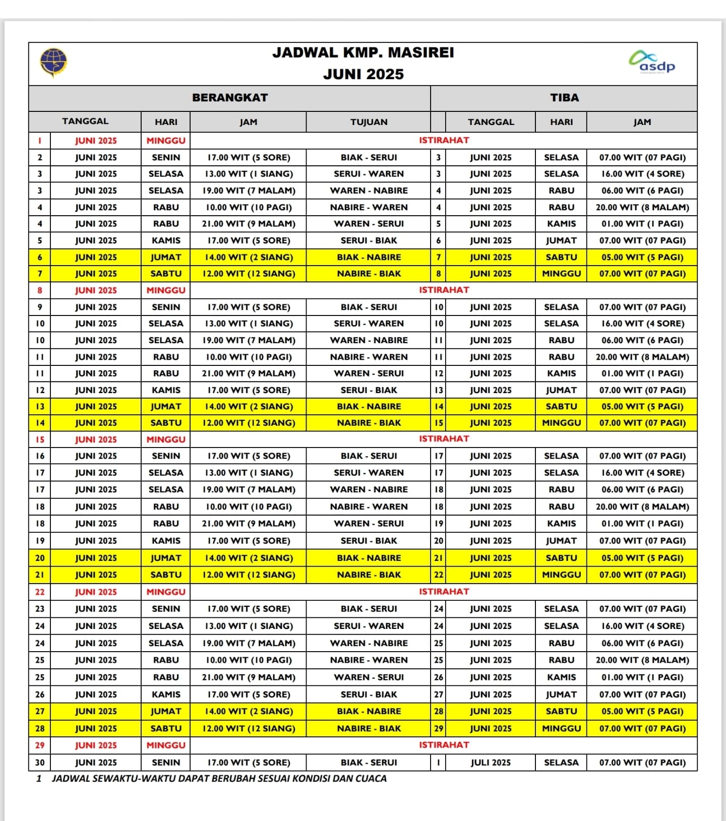 Berikut ini jadwal pelayaran kapal ferry, KMP Masirei selama bulan Juni 2025 :