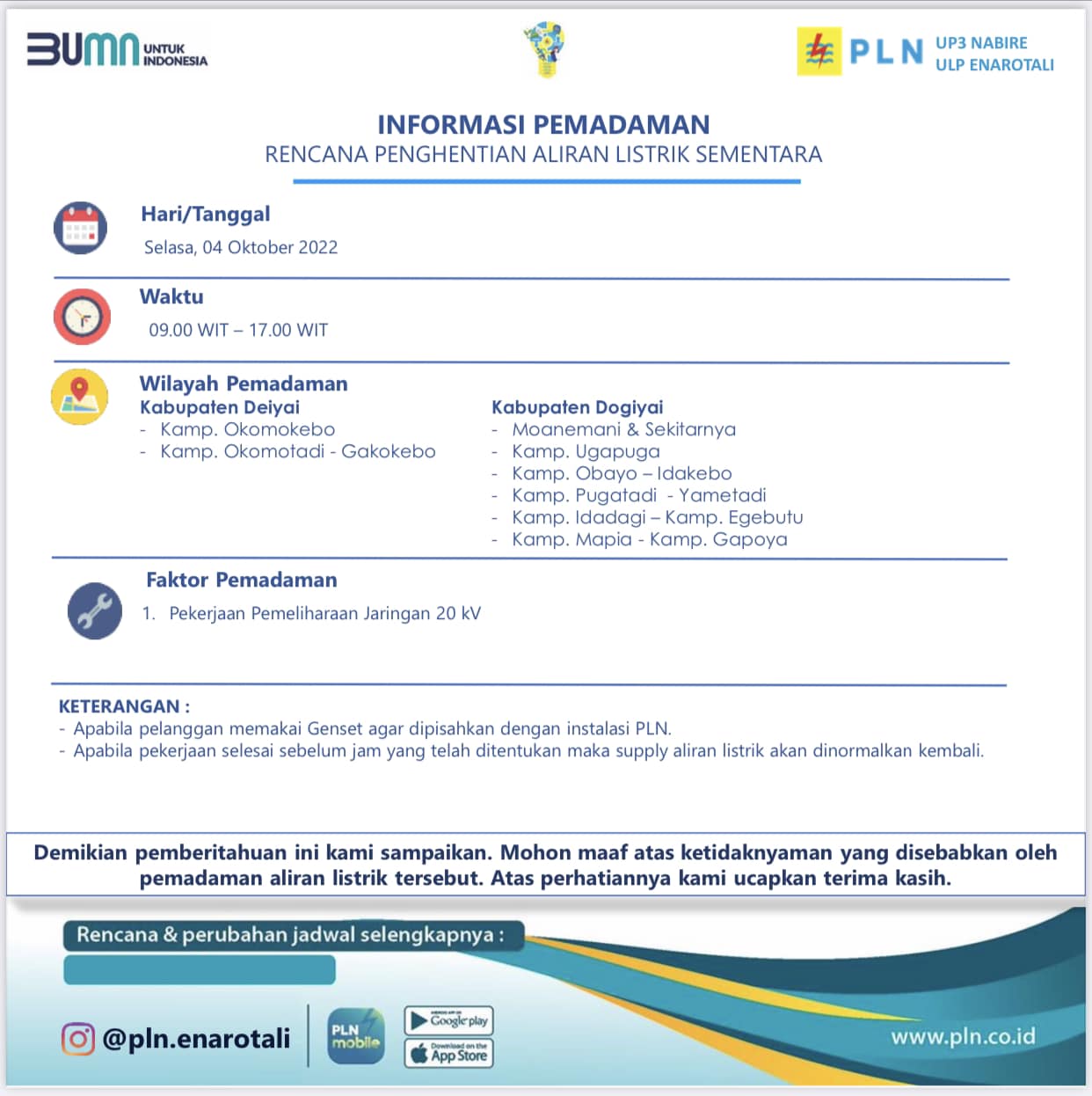 Nabire, Guna kehandalan jaringan Distribusi dan Pembangkit, maka PT. PLN Unit Induk Wilayah Papua & Papua Barat Unit Pelaksana Pelayanan Pelanggan Nabire akan melakukan pemadaman listrik di kabupaten Deiyai dan kabupaten Dogiyai.
