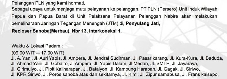 Nabire – Guna kehandalan jaringan Distribusi dan Pembangkit, maka PT. PLN Unit Induk Wilayah Papua & Papua Barat Unit Pelaksana Pelayanan Pelanggan Nabire akan melakukan pemadaman listrik, dalam rangka pekerjaan pemeliharaan JTM Penyulang Jati, Recloser Sanoba (Merbau), NBR13, Interkoneksi 1.