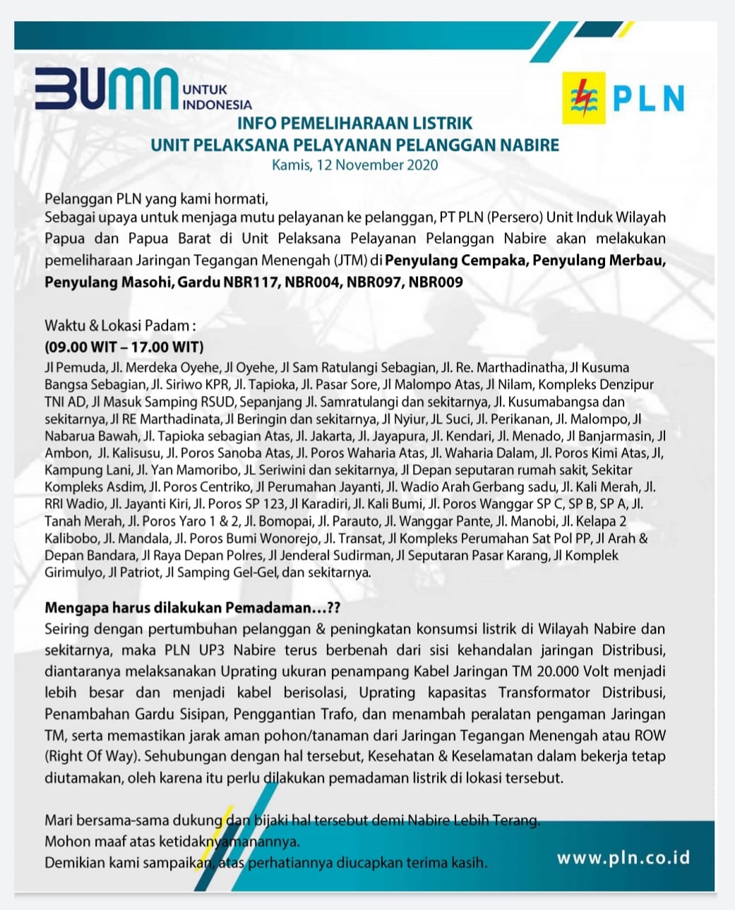 Atas ketidaknyamannya, PT. PLN Rayon Nabire memohon maaf kepada pelanggan PLN di Nabire.